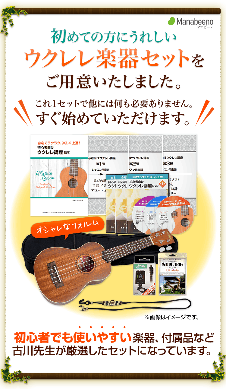 「マナビーノ ウクレレ講座DVDセット」は、その第一歩を最も確実に、そして楽しく踏み出させてくれるツールです。迷っている時間はもったいありません。今すぐウクレレのある生活を始めて、心躍る毎日を手に入れましょう。