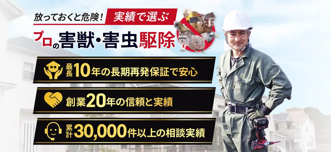 駆除ザウルスは、ネズミ、ハクビシン、アライグマ、イタチなどの害獣から、シロアリ、ハチなどの害虫まで幅広く対応する総合駆除サービスです。日本全国(※一部離島を除く)にネットワークを持ち、迅速な対応と確かな技術力で、住まいの安心を守ります。