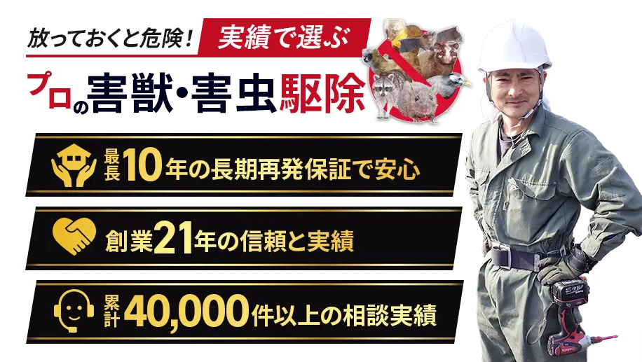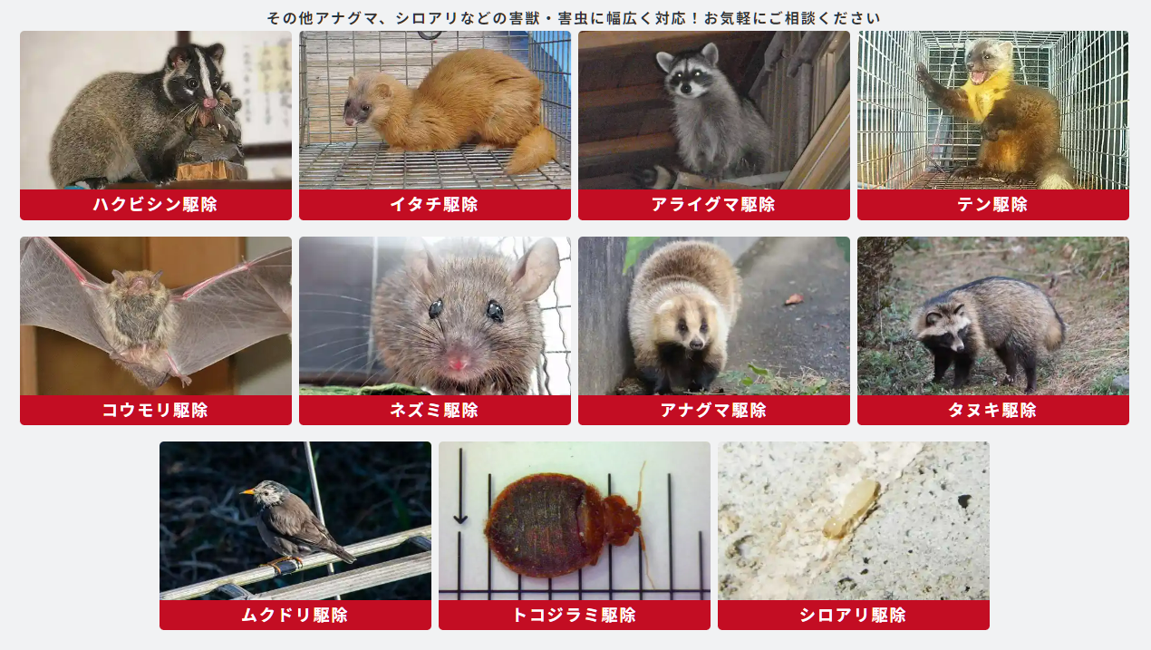 ネズミ、ハクビシン、アライグマ、イタチ、コウモリなどの害獣をはじめ、シロアリ、ハチ、ムカデなどの害虫、さらにはハトなどの鳥害対策まで幅広く対応しています。気になることがあればお気軽にご相談ください。